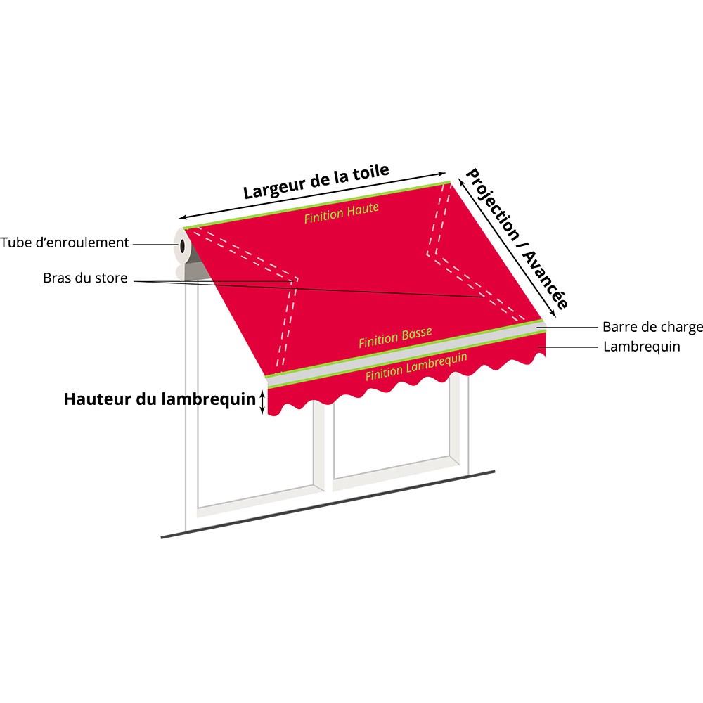 Indiquez les dimensions de la toile d'une extrémité à une autre (fourreau/ourlet inclus). Les dimensions a indiquer sont les dimensions de la toile finis en mm et non celle du store (voir bulle d'info).